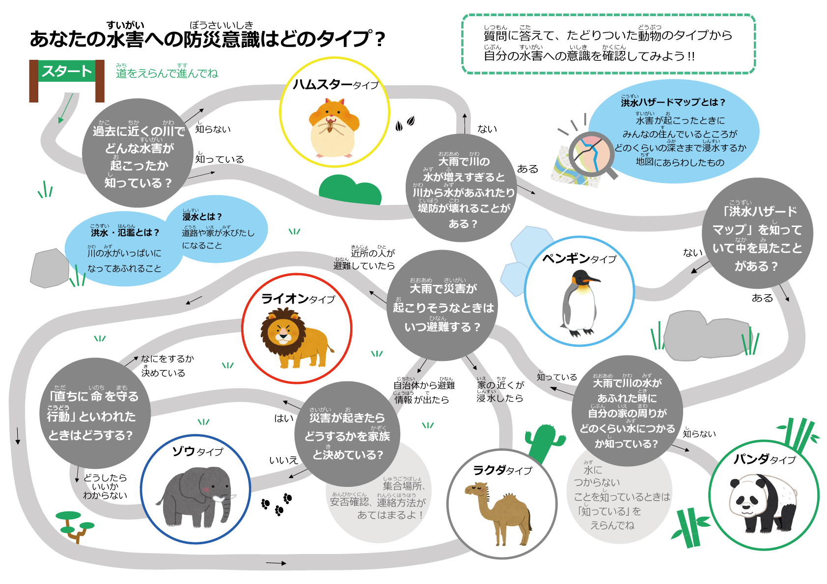 災害発生時に適切な防災行動をとるためには、日頃から災害を「自分事」として捉え、備えておくことが重要です。そこで当社は、防災意識が高くない層の方にも、「楽しみながら」防災意識を持ってもらうことを目的に、親しみやすい動物のイラストを用いた「防災アニマル診断」を開発しました。フローチャートに沿っていくつかの質問に答えると、6種類の動物タイプに分類され、自身の防災意識レベルが判定できます。さらに、それぞれのタイプに必要な防災知識が解説されています。