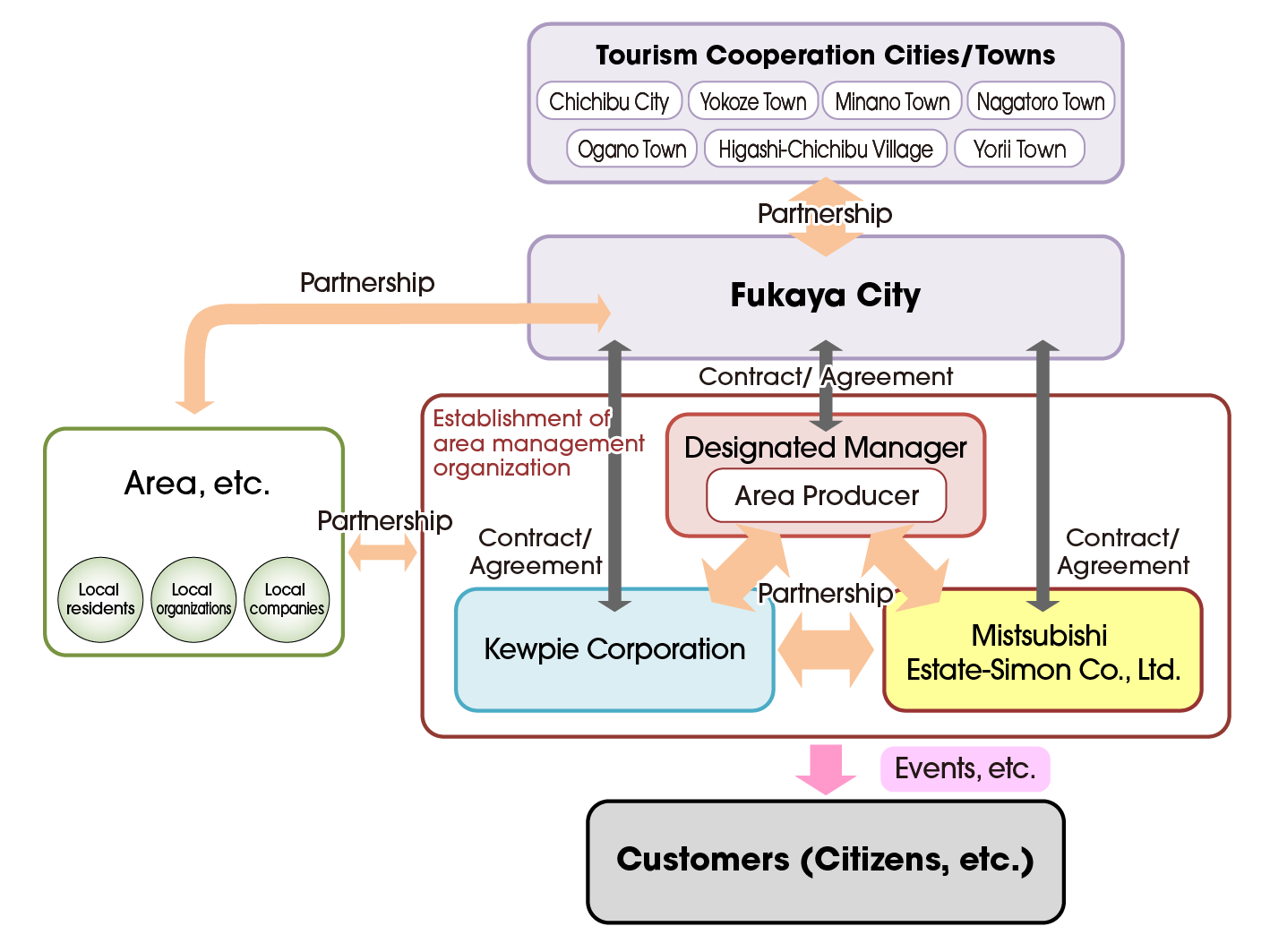 In addition, we supported the city in building a specific scheme for breathing life into the community as a whole, collaborative tourism with surrounding municipalities, and area management to help revitalize the region, and with formulating a maintenance and management agreement with private zone developers and operators.