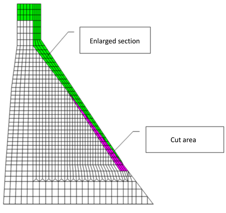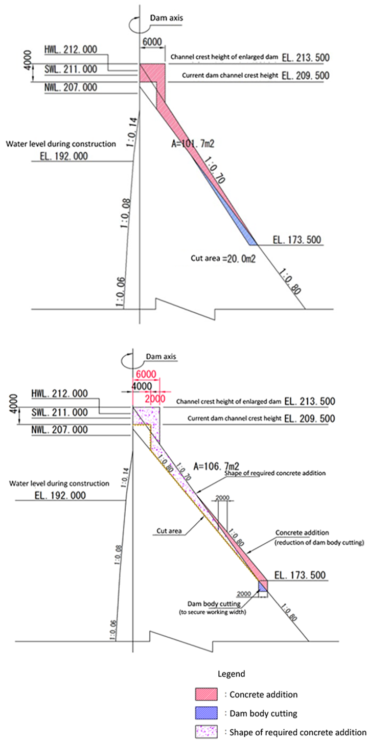 In order to unite the new and existing dam bodies, part of the existing dam body needs to be cut for laying the additional concrete for dam enlargement. The wider the section cut out, the greater this task will impact project feasibility and scheduling. Thus, a distinctive dam geometry was adopted in an effort to reduce costs and schedule time, starting the concrete addition for the Kasabori Dam enlargement from midway up the downstream surface of the dam. The basic geometry was confirmed to be safe using a 2D design method. Since the raised portion of the downstream concrete addition is discontinuous in shape, a finite element analysis was conducted using a 2D section to check for shape-induced stress distribution issues. Given the thickness of the concrete addition, a temperature stress analysis was conducted to study measures for preventing temperature cracking. Also, seismic performance tests were performed on the finished shape using level 2 seismic motion.