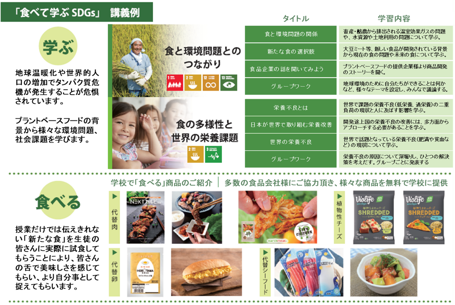 中学生にプラントベースフードを実際に食べてもらうことで興味を持ち、さらに授業を通じてプラントベースフードが登場した背景を起点に、食に関する世界的課題やSDGsを学ぶといった新しいスタイルの食育プログラムです。