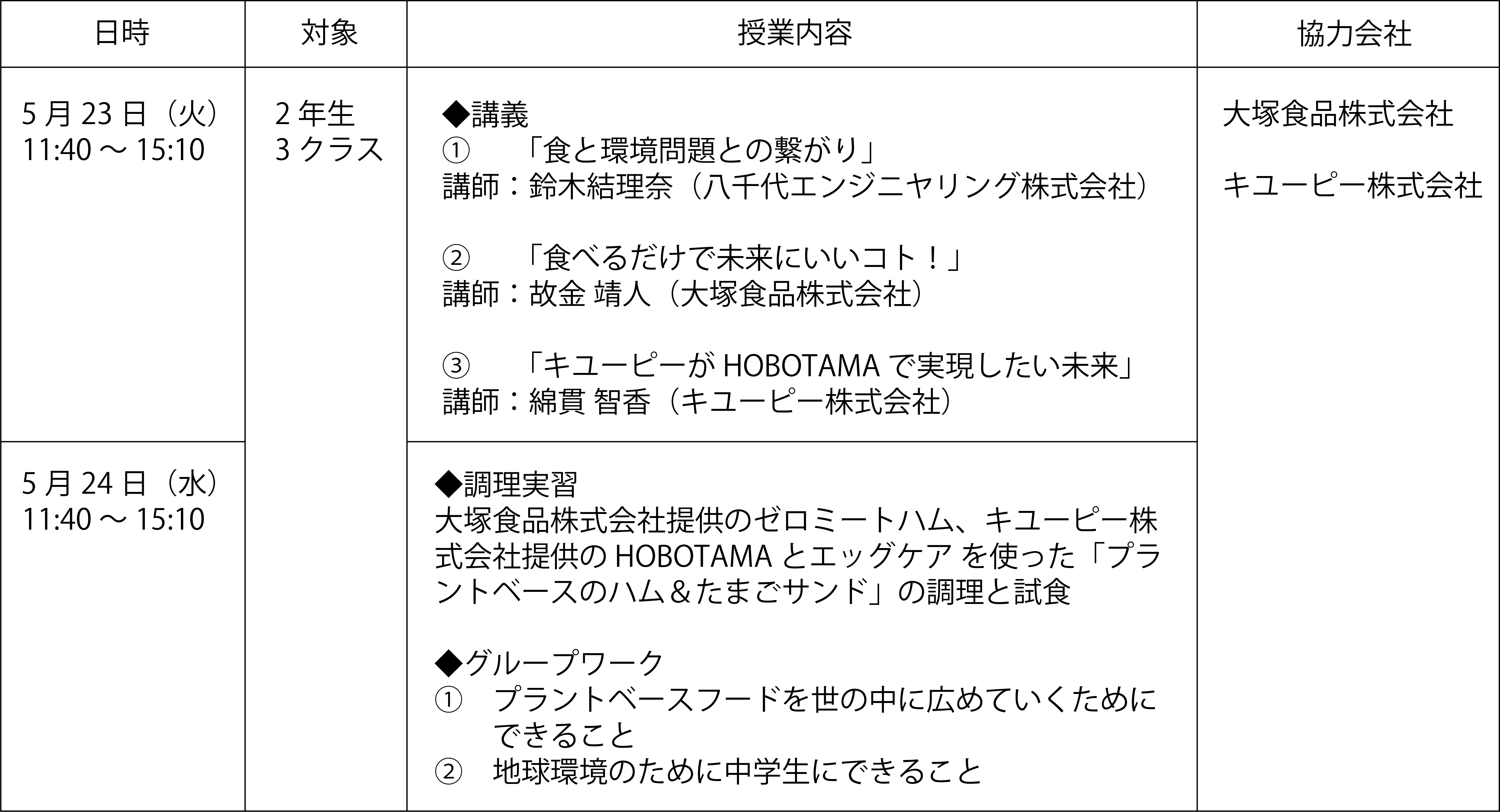 八千代エンジニヤリング株式会社(本店:東京都台東区、代表取締役社長執行役員:高橋 努)は、大塚食品株式会社 (本社:大阪府中央区)、キユーピー株式会社(東京都渋谷区)と協働で、大阪教育大学附属平野中学校において食育プログラム「食べて学ぶSDGs」を実施します。