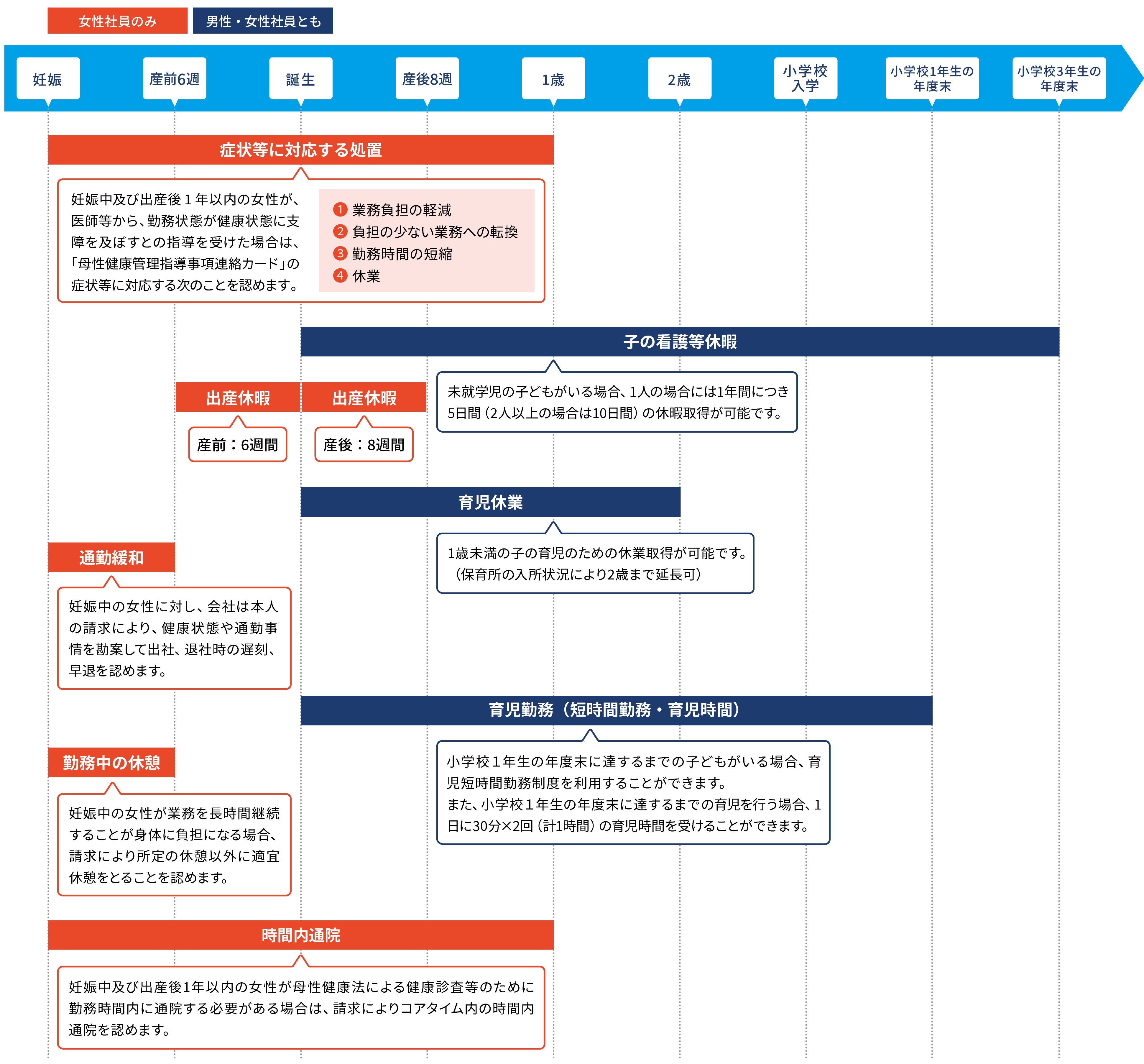 次世代育成支援として、社員が安心して出産・育児と仕事との両立が図れるよう、妊娠から小学校3年生の年度末に達するまでの子育て支援策を整備しています。